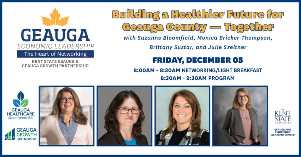 Co-sponsored by Geauga Growth Partnership and Kent State University at Geauga. These events are an opportunity to bring business and industry leaders together with our community to network, learn, and collaborate. Each event is intended to foster a heightened awareness of business, industry, and public services present in Geauga County and to facilitate networking among the members of those sectors. Anyone working or living in Geauga County will benefit from learning more about our local employers and services.