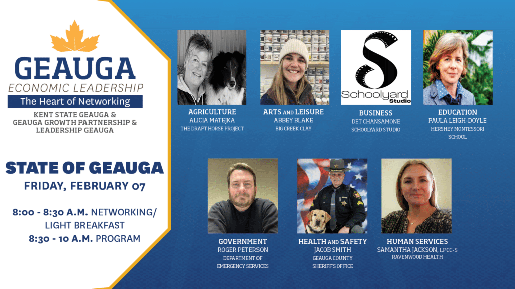 Co-sponsored by Geauga Growth Partnership, Kent State University at Geauga and Leadership Geauga. These events are an opportunity to bring business and industry leaders together with our community to network, learn, and collaborate. Each event is intended to foster a heightened awareness of business, industry, and public services present in Geauga County and to facilitate networking among the members of those sectors. Anyone working or living in Geauga County will benefit from learning more about our local employers and services.