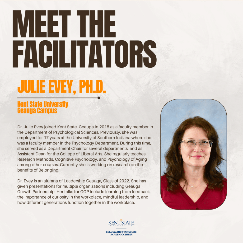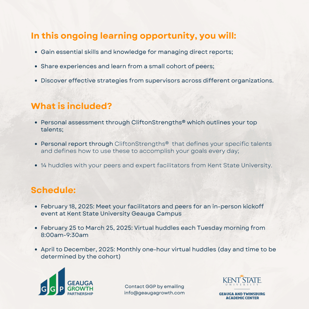 Geauga Growth Partnership, in collaboration with Kent State University Geauga Campus, is excited to launch a new Peer Group designed specifically for newly promoted or recently hired supervisors, especially those stepping into a management role for the first time. Designed and facilitated by KSU Geauga professors, Julie Evey, Ph.D. and Velvet Weems-Landingham, Ph.D.